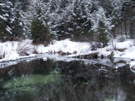 With my snowshoes I can get out back, behind the barn, to the compost pile and return safely. With my snowshoes I can take a leisurely slog through snow-shrouded woods, winding and wandering further up the watershed, all the way to headwaters of the Neverwas River, where the free-flowing spring never freezes. Here, the water brings with it powdered marble from miles away which churns in ever changing patterns beneath the snowy sky. Here, I can kick the snow off and from around one of my favorite sitting stumps and have a seat with a ration of rum while I breathe smoke and contemplate the silence.