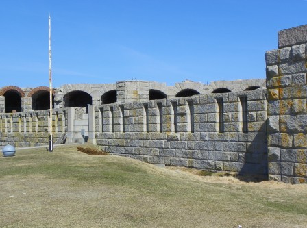 An old fort, built during the Civil War to protect the ship building interests in Bath, sits imposingly on the point. Each arched “room” was a cannon emplacement and if they had ever finished the darn place, they could have blasted pretty much anything that tried to pass. The walls still stand, home to gulls and some very attractive pigeons.