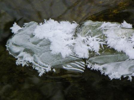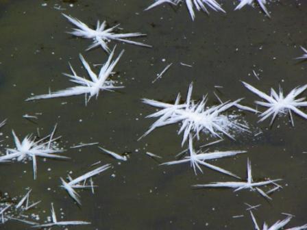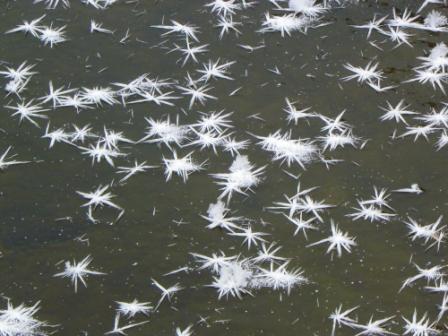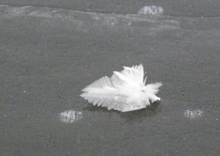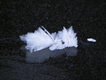 In other places the frost blooms take on a different appearance, radiating spikes across the cold, dark ice. These will be gone, too, by afternoon, all traces erased by the breath of a breeze or the impact of snowflakes.