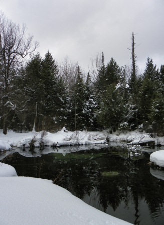 There’s a bench back there and, after digging it out, I like to pause and take a break from the work of breaking the trail. Even on a cold January day midges take wing, launching themselves into the chill air. Some are immediately crippled, their delicate, damp wings frozen stiff, and I find them crawling on the snow, trying to make their way back to the water. Others manage to do what midges do, mating no matter the weather. They and their offspring also provide nice mid-winter snacks for the dace and the brook trout that make the trip up from the lake from time to time.