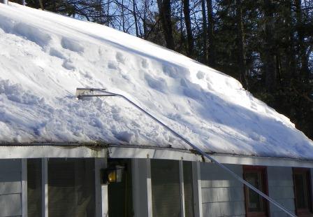 I do not know how many strokes it takes to clear a sizeable roof but I think it is about the same number as licks to get to the center of a Tootsie Pop. The goal was not to completely clear the roof, but to lessen the stress on the roof members, so once I felt better about the snow load I declared victory and limped my way to the next building, unable to draw any further analogies between roof raking and Tootsie Pops.