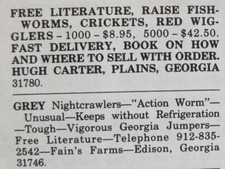 In this pair of ads, the top one was placed by Hugh Carter, a Georgia state legislator, businessman and cousin of President Jimmy Carter. The bottom one is interesting because it features a gray worm that needs no refrigeration, the Vigorous Georgia Jumper!