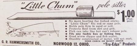 For only a buck, a bank fisherman could fix himself up with the “Little Chum” pole sitter, a rod holder slash worm digger slash fish scaler, one of fishing’s first multi-purpose tools. But Mister, why bother with all that hard labor?