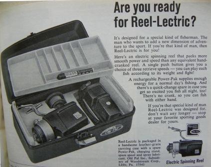 The 1967 Reel-Lectric was designed for a “special kind of fisherman” and, with no crank, those “special” guys could fish with either hand! They could fish all day with the rechargeable “Power-Pak” before popping in the spare to fish all night, too!