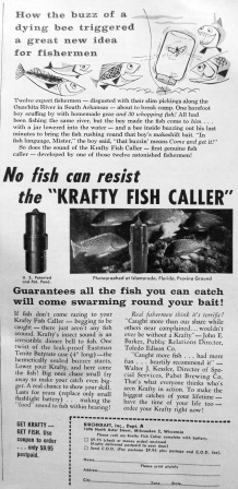 Then again, why spend half the day trying to steer a rudderless plastic box through the weeds and rocks when a Krafty Fish Caller will have fish racing in from far away, just “begging to be caught.” Twelve fishermen (not just a couple), outfished by a kid with a bee in a jar and what do they decide they need? A hermetically sealed case with an electric buzzer inside! No more need for careful observation or bee-catching skill to fill that frying pan!