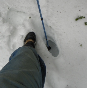 So how does one find out if the snow in the woods has packed and settled enough to walk without snowshoes? I am glad you asked because I have come up with a way to scientifically determine the depth and texture of March snow in the woods and now you can, too.