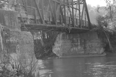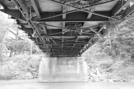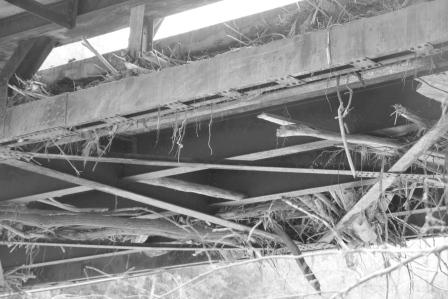 Sizeable chunks of trees and other debris are woven into the steel framework more than twenty feet above the river bed.