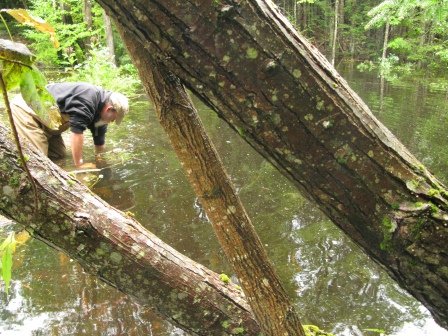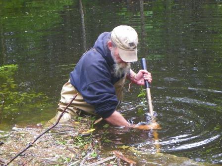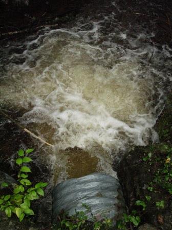 Unable to find the upstream end of the culverts in the cold, dark water, I worked carefully from the downstream end of one, reaching in, snagging and pulling what I could with a long-handled, four-pronged cultivator. Each reach brought out more debris and soon the slow drip of water became a trickle. Balancing carefully on the slippery rocks at the mouth of the culvert, I prepared to stretch into the 24-inch pipe for one more grab with my tool. As I bent to the task a tremendous noise like a fart echoed through the woods.