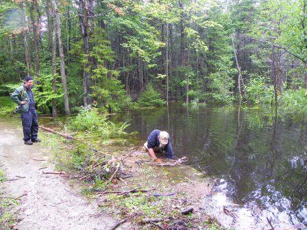 Every night for a week the beavers did their level best to permanently plug the culverts and every morning I did my level best to clear them, all the while being careful to not be sucked through the pipes at the upstream end and not get skewered or crushed by the debris coming out the downstream end. The arrival of my friend Vic Salvo allowed the documenting of work that normally gets done alone, out in the woods where no one sees what goes on. It’s not often that a guy has his own personal photographer along. It is probably even less often that the photographer has his own photographer along …