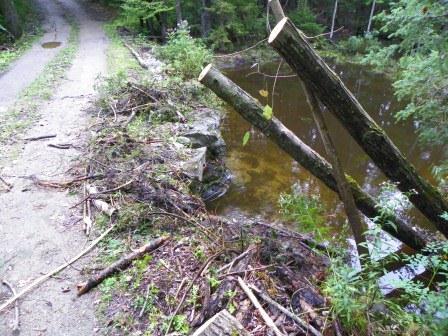 They began with a few sticks, clumps of grass, and a lot of mud, but I tore those things out. The next night they floated in chunks of birch and downed spruce trees. At their dinner break they ate the bark off a clump of young maples, creating half a dozen naked, twelve-foot poles which they shoved length-wise into the pipes, followed by more mud, grass and whatever else was handy.