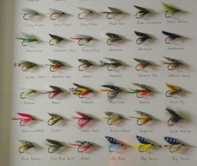 The wet flies in the photo represent the flies from a color plate used in Ray Bergman’s book Trout, first published in 1938, and were tied by Don Bastian. Don was a guest at Fish in a Barrel Pond this summer and was kind enough to let me try some photos of the reproductions he has done of the plates from Bergman’s book.