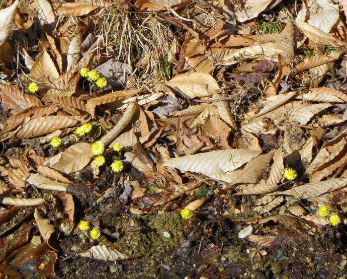 Along the muddy edges of roads and paths, colt’s foot blooms, sending up flowers as early as possible but holding back on the leaves until the danger of frost has passed.