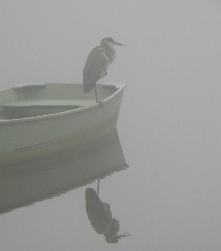 Migrating mergansers paddled idly, waiting for the fog to lift, and a great blue heron sat out its flight delay by preening and napping on one of the boats.
