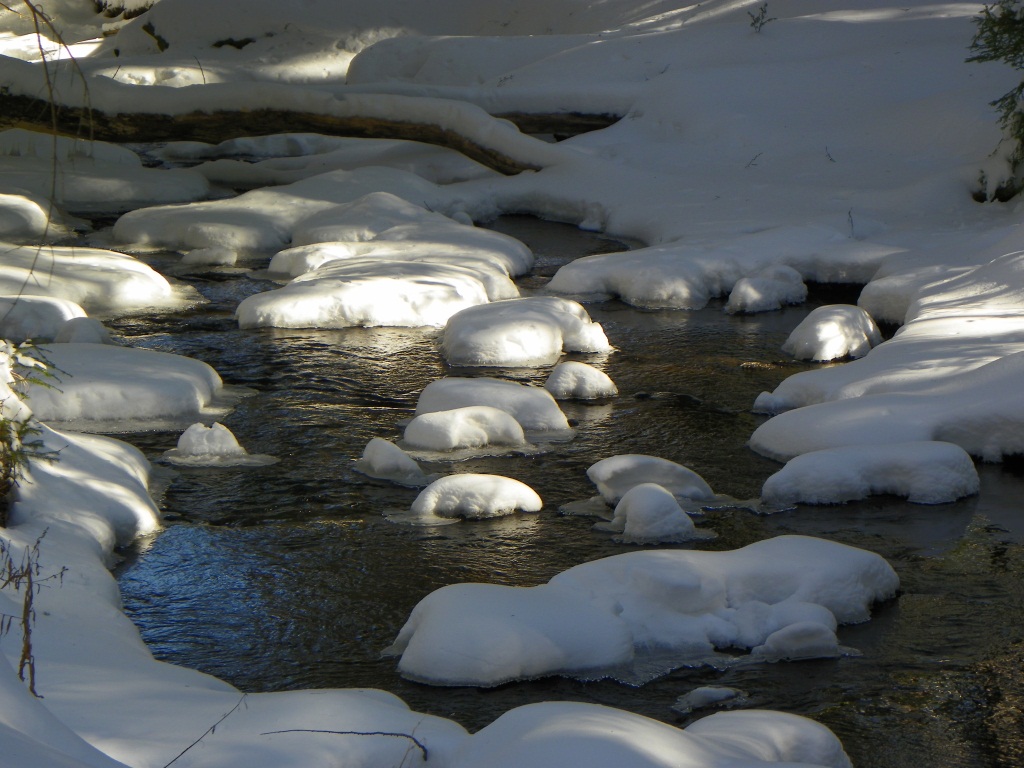 Water again flows in brooks that were frozen solid two weeks ago, while cobbles and stones wear crowns of snow.