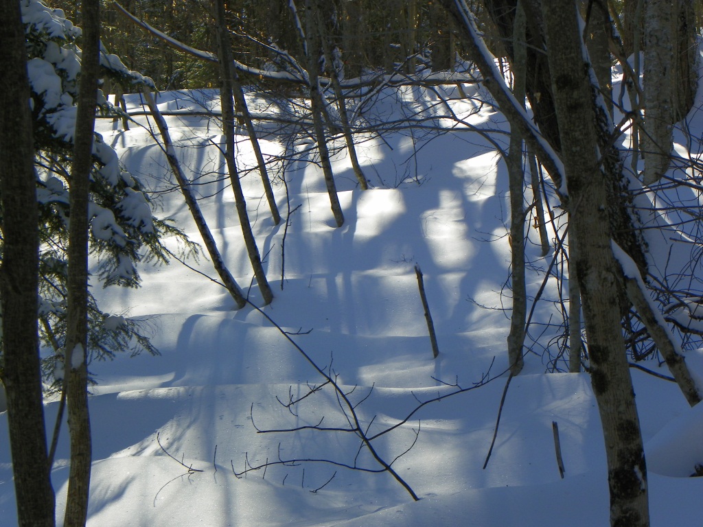 Undulating blue shadows give form to the drifts, which roll gently in the shelter of the trees.