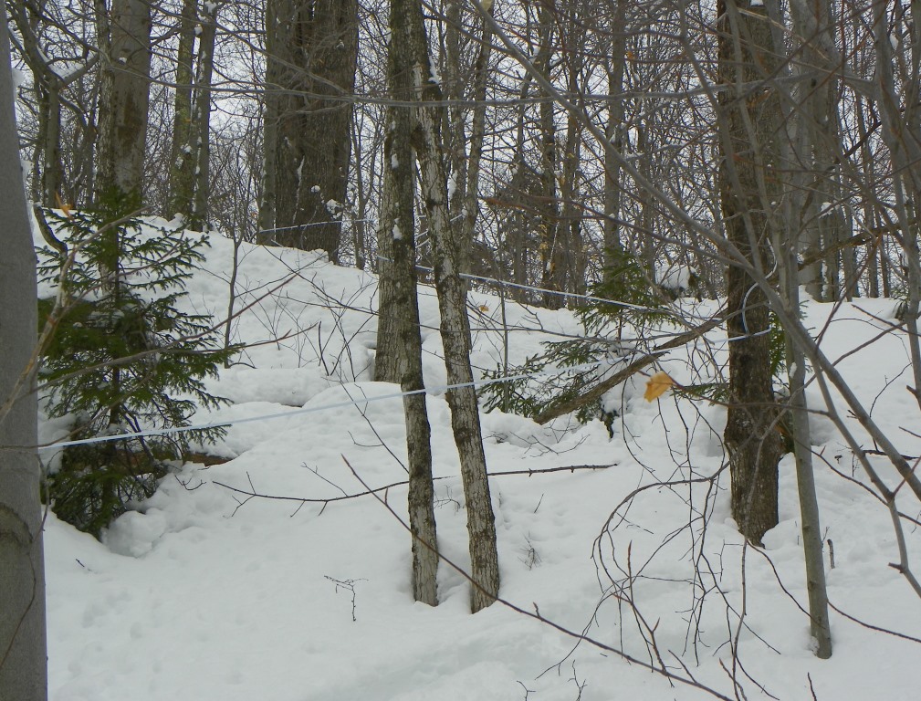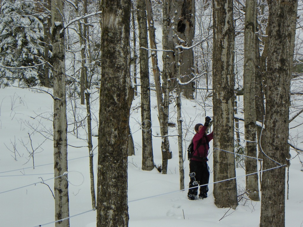 Plunging ahead, I used my not inconsiderable size to my advantage and plowed my way down the run to the last tree on the line. Watching the first drops of sap drip into the tube I’d just connected, I took a step back to admire my work, but just for a second, because the tail of my right snowshoe dug in and I spun around, sticking my left snowshoe between two small beeches, throwing myself into one of the niftiest figure-4 leg-locks ever, from which I admired the sky.