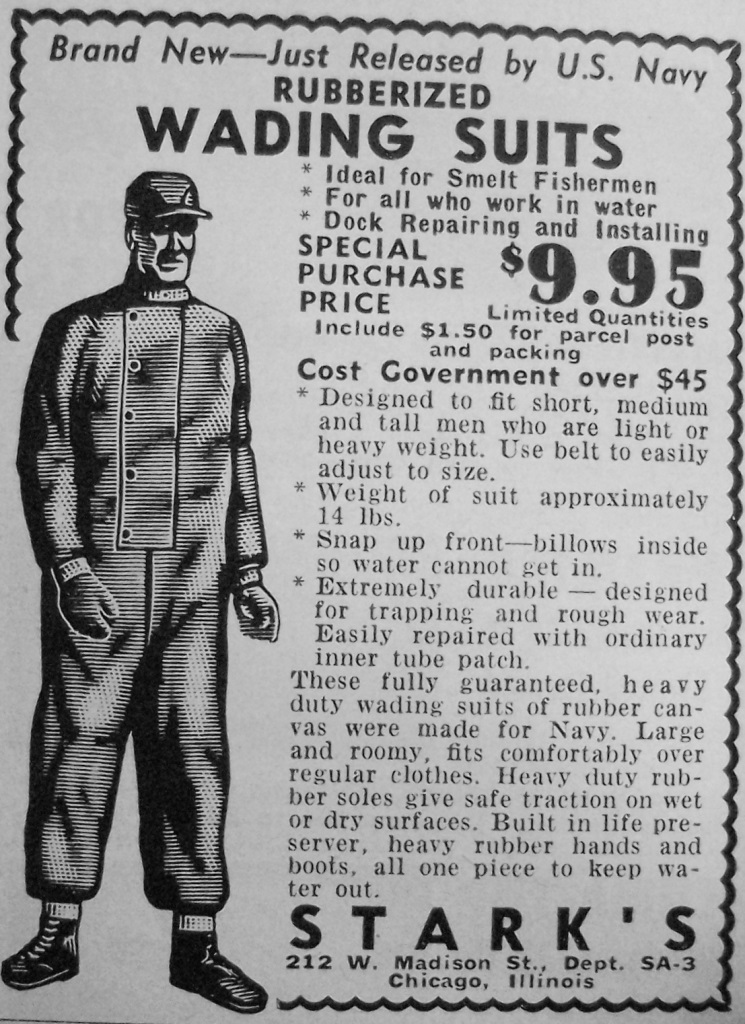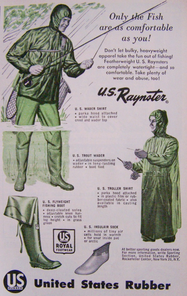 It is no secret that outdoorsy folk run the risk of getting wet and rod manufacturers were not the only ones using modern materials to the benefit of anglers and others. In 1956, a spiffy vinyl rain suit could be had for less than five bucks!