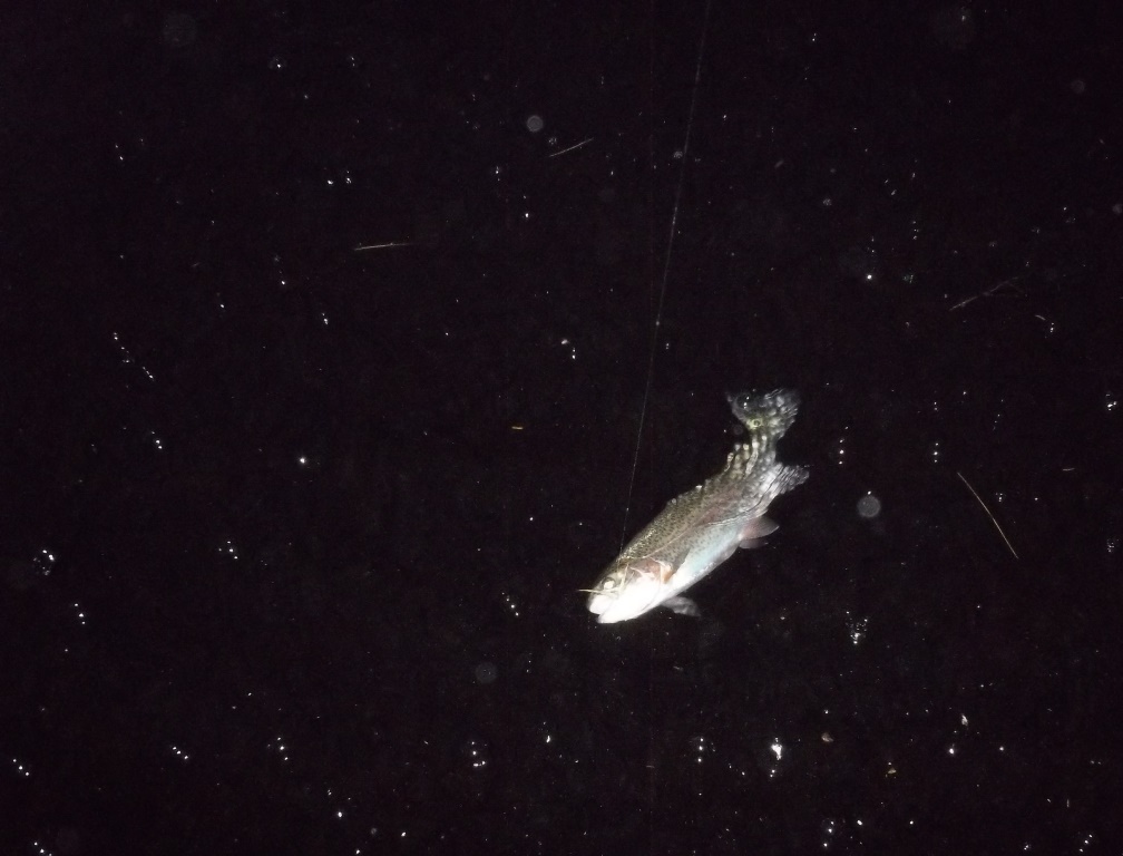 The first Hex popped up as the first drops crashed down. Its flimsy new wings took a beating and it flexed feebly in an effort to free itself from the water but it disappeared in a swirl, as did three more in succession nearby. The first cast, close to shore, aimed for the expanding silvery rings of a rise and the fly was taken immediately by a nice rainbow, full of bugs and fight.