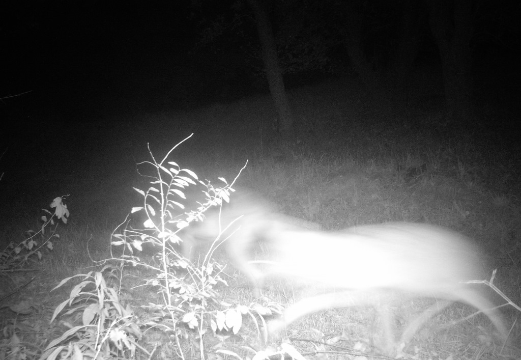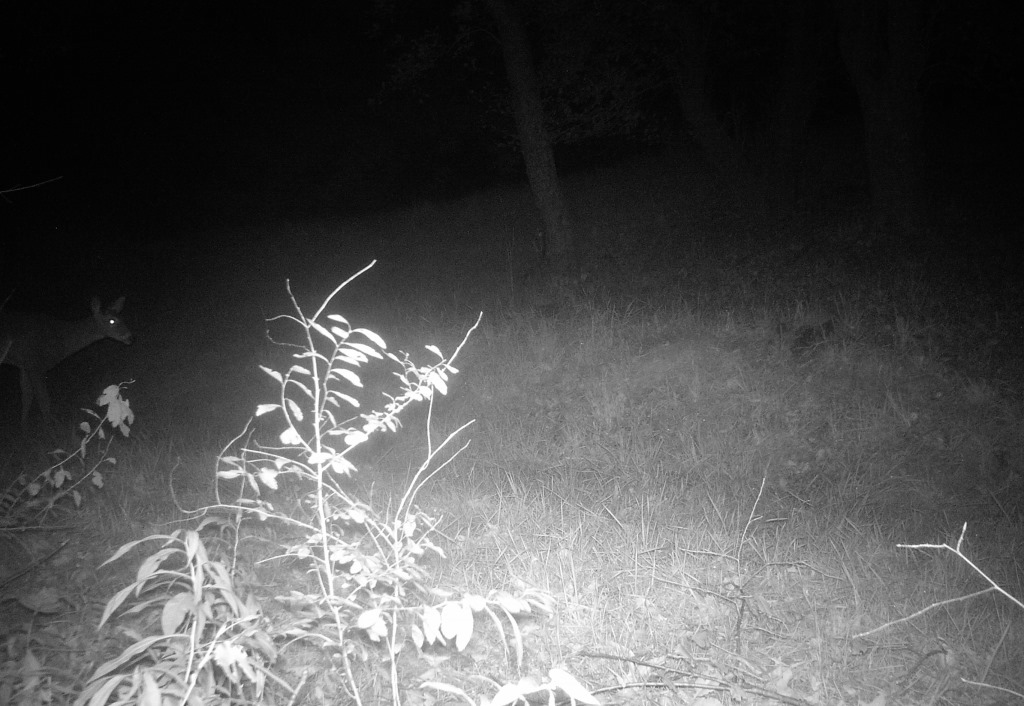 So, who was this drunken fool running around in the dark, and just what was his problem? I had a theory, along with a game camera, and the next night I put both to work, capturing this image of the culprit in the orchard out back: