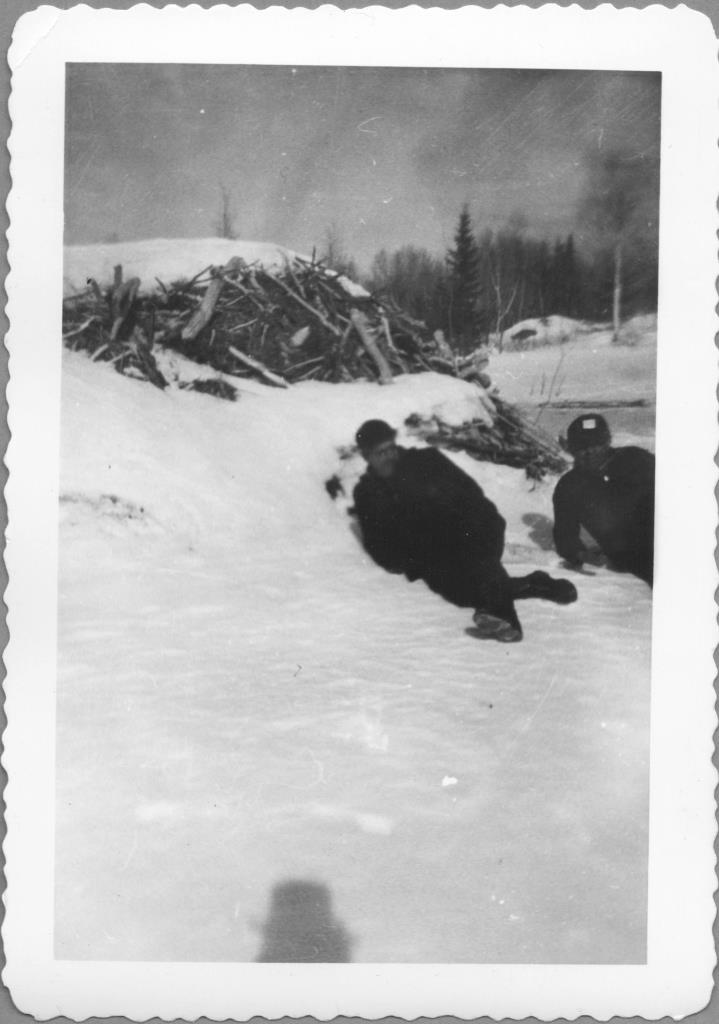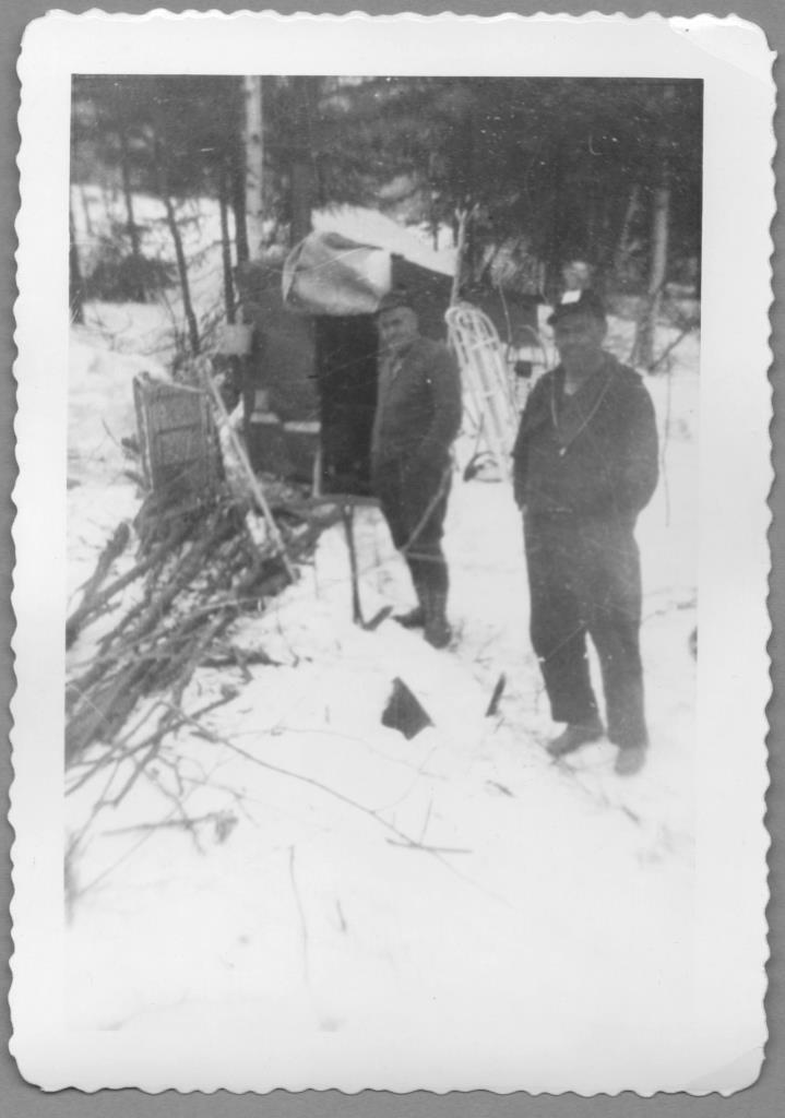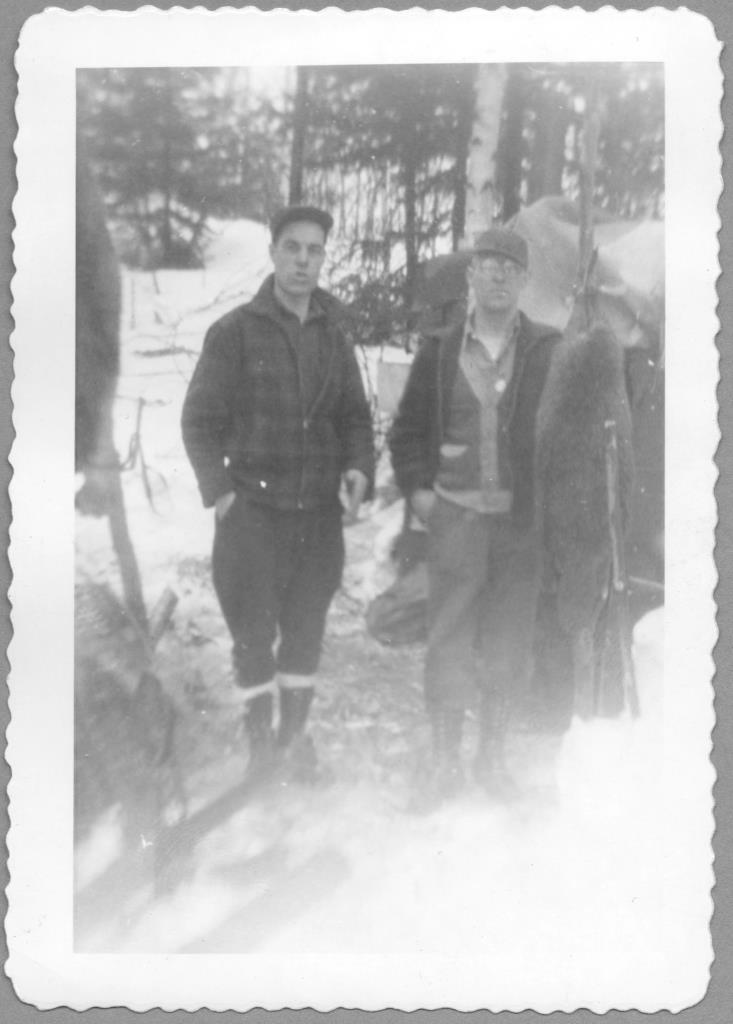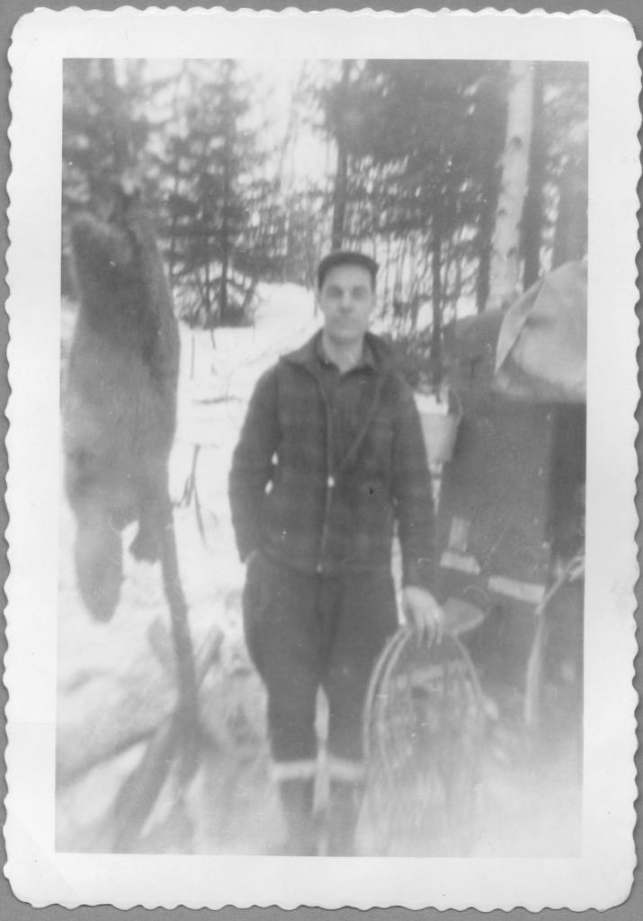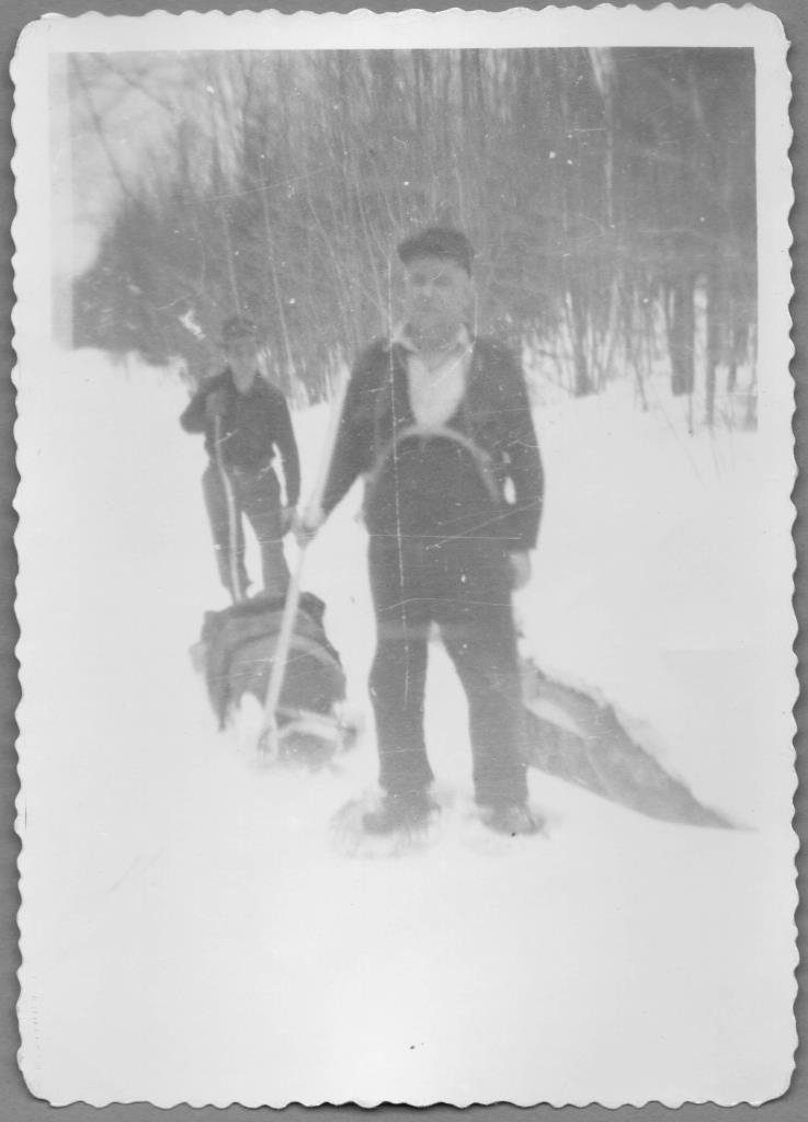 There are no dates on these photos I found but I am guessing they were taken in the late 1940s or early 1950s. They record a group of men who traveled on snowshoes for a couple days of beaver trapping. Blurry and badly exposed, these photos were probably a big deal to these guys. Back then, the cost of a roll of film, plus processing, confined picture taking to special occasions and events. When the pictures finally got back from being developed these men probably got together again to look at them over coffee and cigarettes after dinner, before spending the rest of the evening playing cribbage and telling stories.