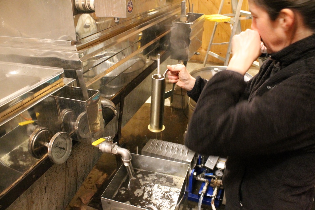 Scalding hot, sweet and sticky, it’s not syrup until its density is just so. Slow dribbles were drawn and checked until finally, with sleet bouncing off the window panes, a smile appeared and a cheer went up. The first syrup of the season was ready!