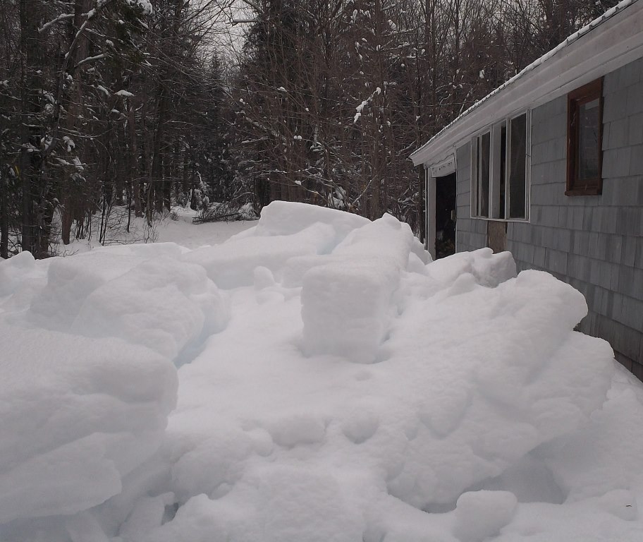 The neighbors are used to seeing me on the road with my snowshoes hanging from a shovel slung over my shoulder. They know I’ve been back to the Queen of the Waters, clearing snow. This year’s snow has been heavy and mixed with rain so it comes off the roof in great icy slabs that land with tremendous thuds. The roof on the Gray Ghost recently shed its load without any help, evidently all at once, and I’m surprised it didn’t register on the Richter Scale somewhere. At least the footing is solid (but very slippery) and it doesn’t take long to get to the camps on foot; in knee-deep powder it can take as long as forty-five minutes to get to Queen of the Waters on snowshoes. Snowshoes only make the impossible difficult but that’s how it is around here sometimes.