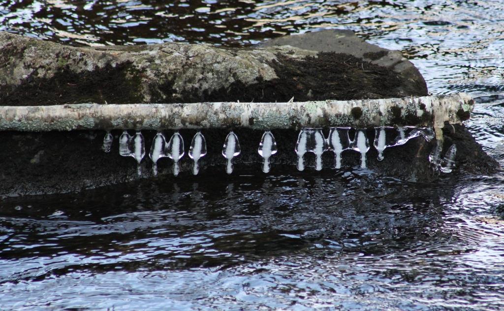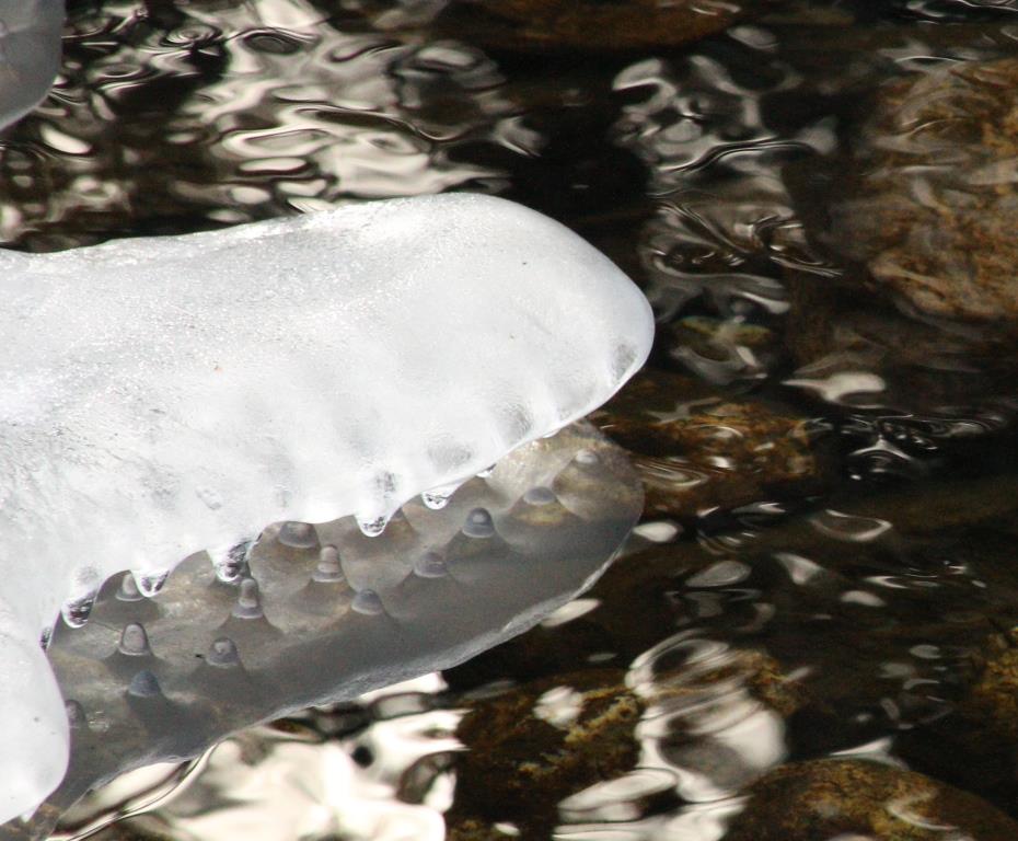 Sometimes the rain continues to fall after the air temperature drops, creating icicles that are thicker at their tips than at their attachment points. They freeze above the point where they meet running water, eroding when the water rises, showing cold nubbins when it drops.