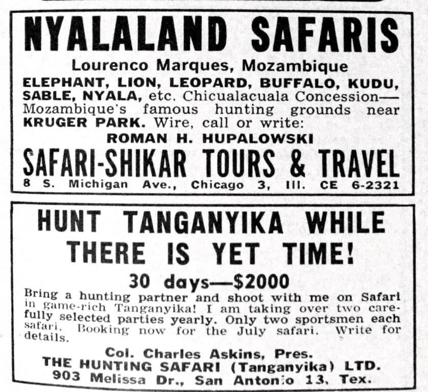 I wonder how he got that reminder ribbon on his trunk, seeing that he had no fingers, but he’s driving a car so who am I to quibble? It may be a good thing he didn’t have fingers or he would have been able to flip to Field & Stream’s advertising section to see ads like these: