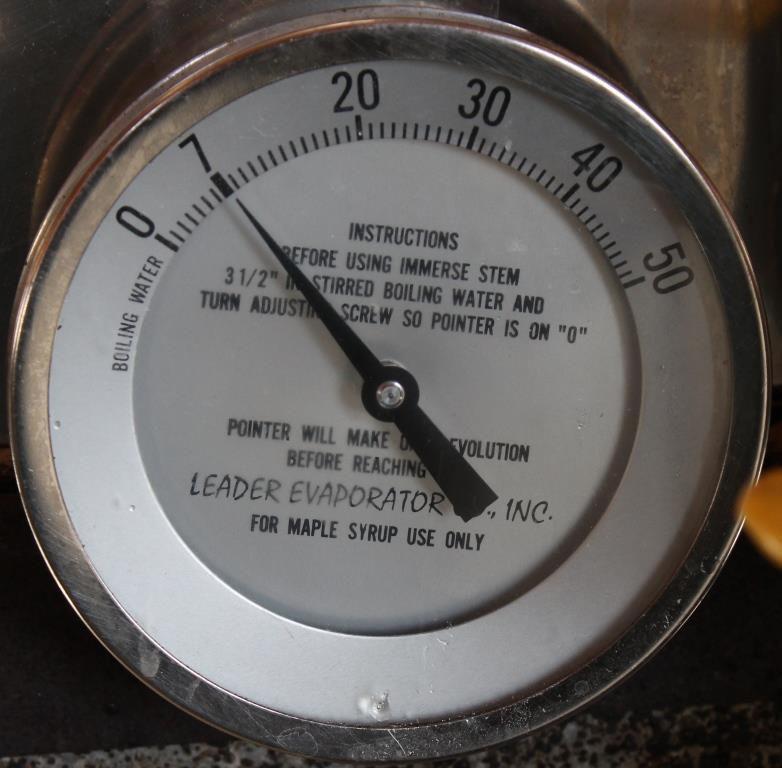 The magic happens at 219°F (103.88°C), which requires a considerable fire. It also requires a special thermometer, calibrated to boiling water at zero, syrup at seven, but notice it is only for maple syrup, nothing else.