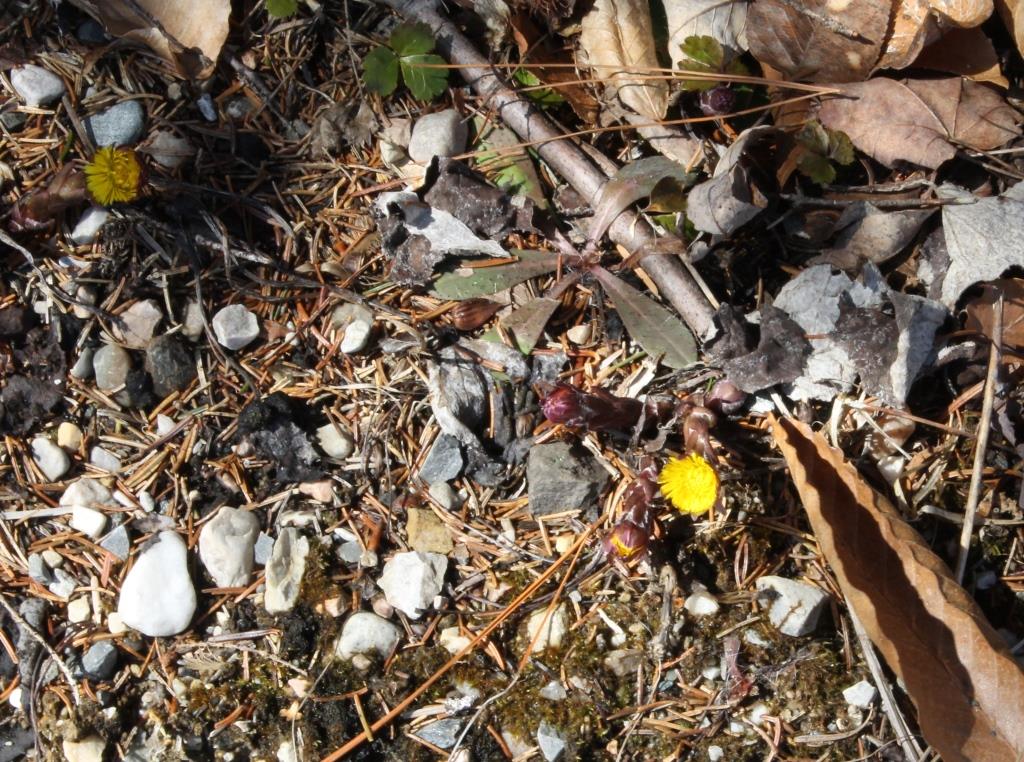 Technically, coltsfoot is not the first flower of spring; the poplars and junipers have been spewing pollen for some time, but their flowers are not conspicuous and they don’t make us smile.