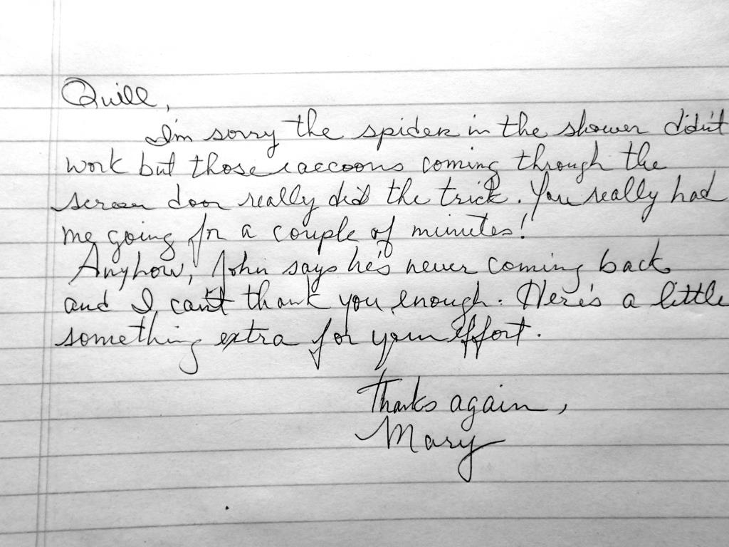 He was clearly distraught but there wasn’t much I could do since I’d been paid good money to put that spider in the shower in the first place.