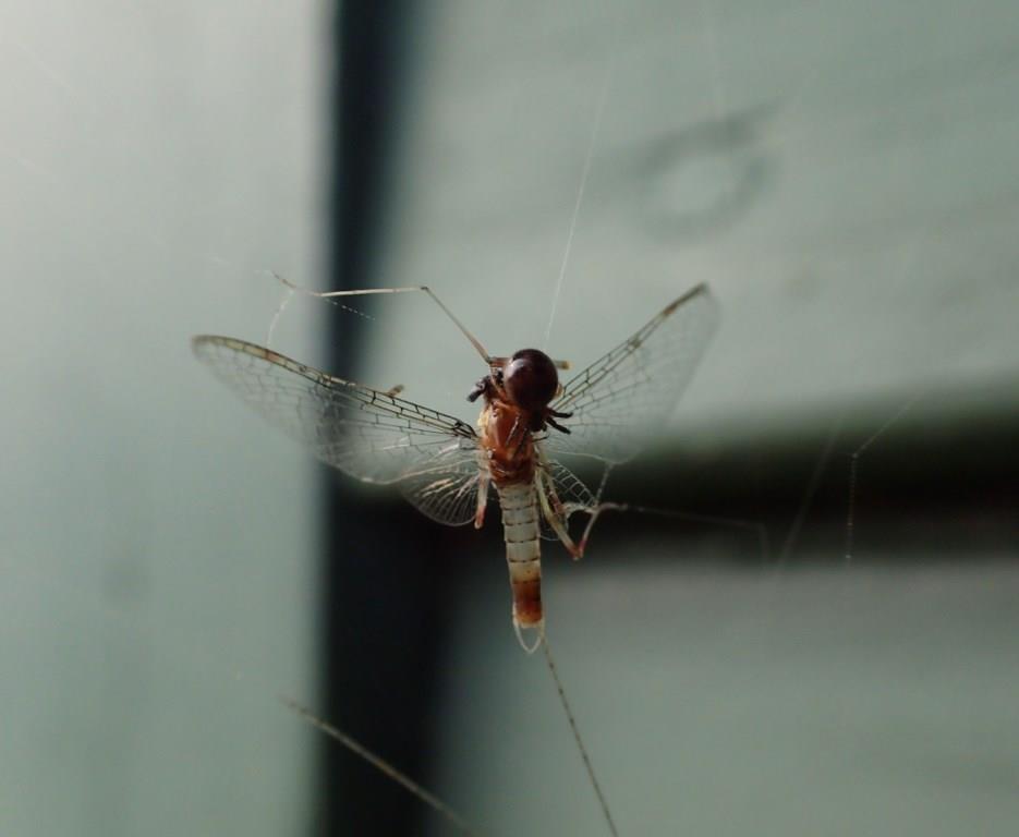 Even Houdini couldn’t get out of the trap just around the corner. Caught as a newly-minted dun, this mayfly went into its final shed only to crawl into more sticky web.