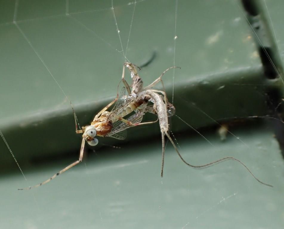 The eaves of buildings are also convenient places for spiders to set up shop and, directly below the shed skin above, we found a mayfly who was going no further.
